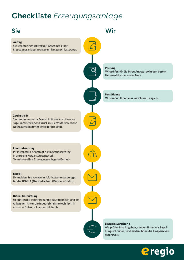 Bitte füllen Sie das Formular „Eigenerzeugungsanlagen“ aus und schicken es uns zusammen mit den technischen Datenblättern Ihrer Anlage und einem Katasterplan mit dem markierten Montageort an einspeiser@e-regio.de.